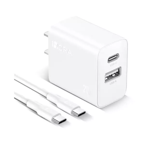 O carregador de duas portas oferece 20 W de potência de saída via USB-C e 18 W via USB-A, totalizando 15 W ao usar ambas as portas. Inclui um cabo USB-C de 1 metro e suporta entrada de 100-240 V.
