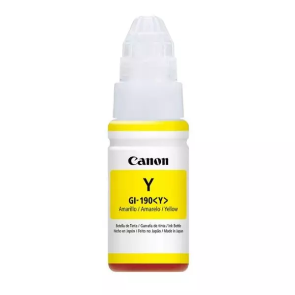 O Refil de Tinta Canon Amarelo GI-190 garante qualidade excepcional, durabilidade notável. O GI-190 frasco de tinta amarela fomulação especial de tinta corante para a obtenção de cores incríveis. A combinação das tintas de cores CMY maximiza a produtividade imprimindo até 7.000 páginas.